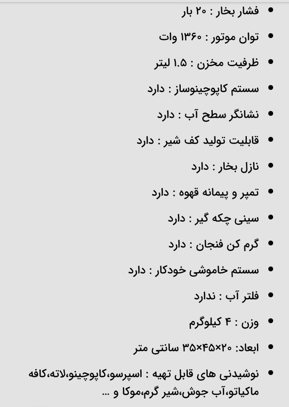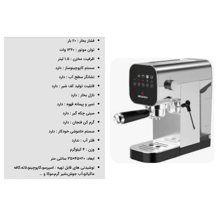 مناسب مصرف : خانگی جنس بدنه : استیل ضد زنگ فشار بخار : 20 بار توان موتور : 1360 وات ظرفیت مخزن : 1.5 لیتر سیستم کاپوچینوساز : دارد نشانگر سطح آب : دارد قابلیت تولید کف شیر : دارد نازل بخار : دارد تمپر و پیمانه قهوه : دارد سینی چکه گیر : دارد گرم کن فنجان : دارد سیستم خاموشی خودکار : دارد فلتر آب : ندارد وزن : 4 کیلوگرم ابعاد: 20×45×35 سانتی متر نوشیدنی های قابل تهیه : اسپرسو،کاپوچینو،لاته،کافه ماکیاتو،آب جوش،شیر گرم،موکا و …